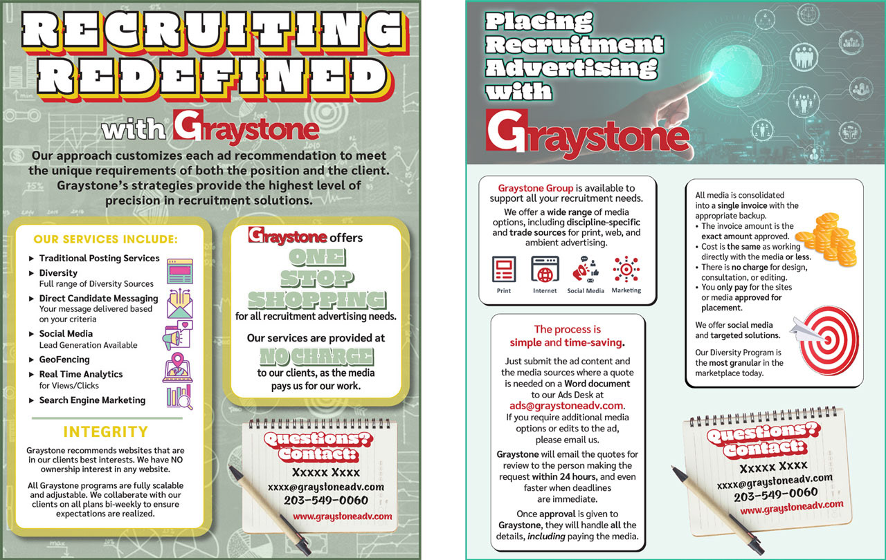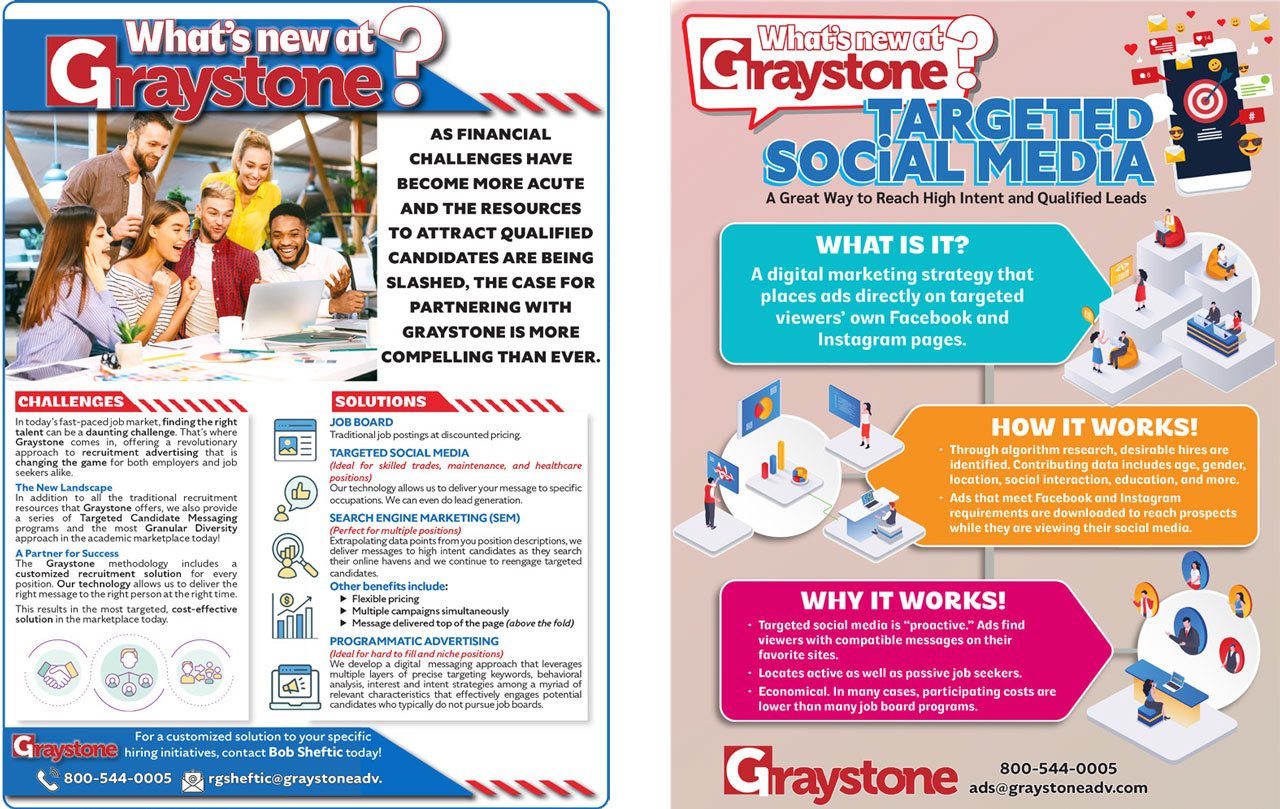I gave Graystone’s promotional materials a full refresh to make them more cohesive, engaging, and easy to read. Using InDesign, Illustrator, and Photoshop, I designed eight new promos and one-sheets with a brighter, unified look. I made the Graystone logo a clear focal point and incorporated colors and graphics that better matched each promotion’s message. The updated materials brought new energy to the brand — and are currently in active use.